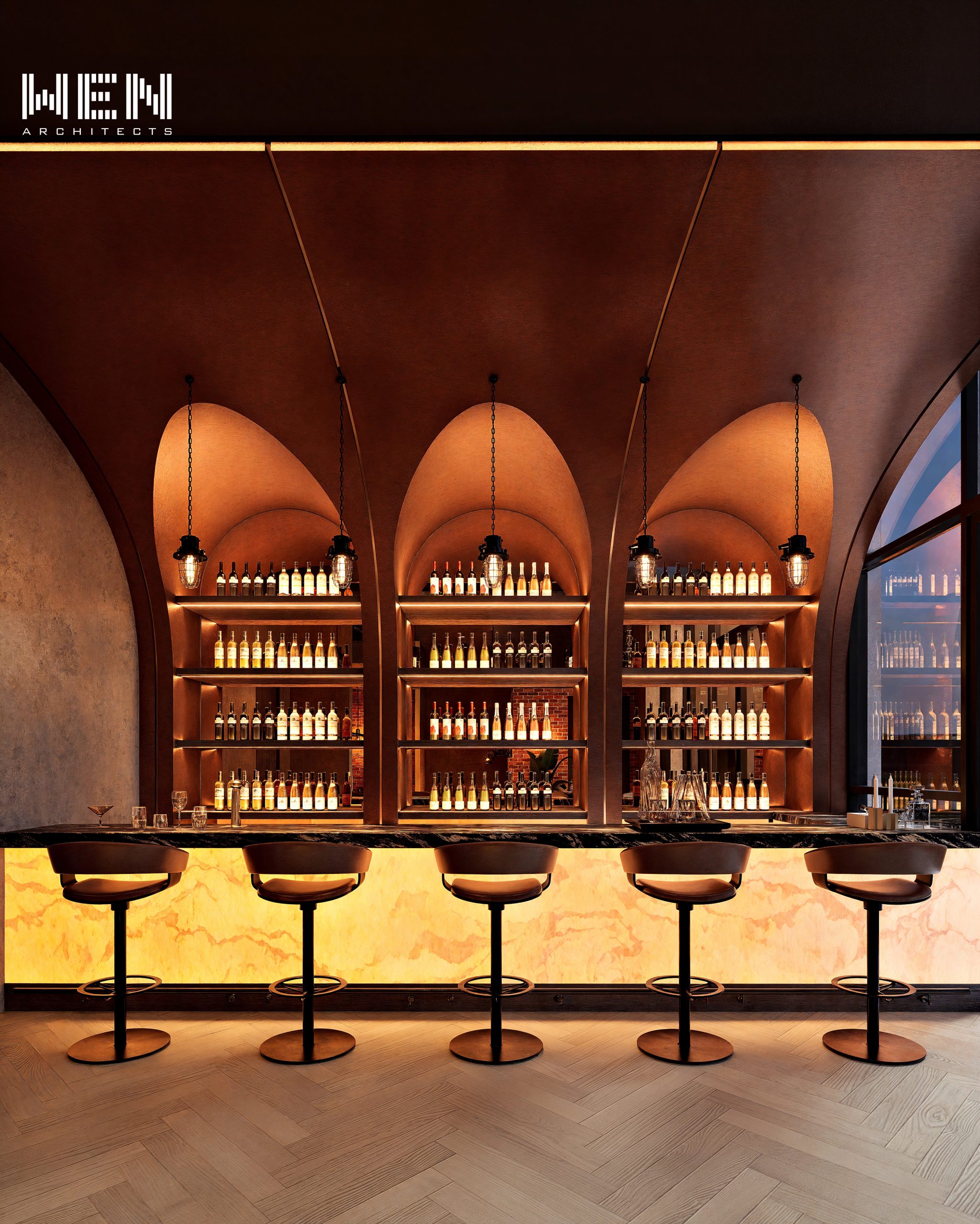 The design responds directly to the site’s industrial past. Broadway was once a key transport and industrial corridor in Sydney. In the entry and public areas, red brick, aged copper, and warm lighting recall the materiality and atmosphere of this history. The bar acts as a social anchor—more than a functional element, it reflects Australia’s culture of gathering, conversation, and connection.