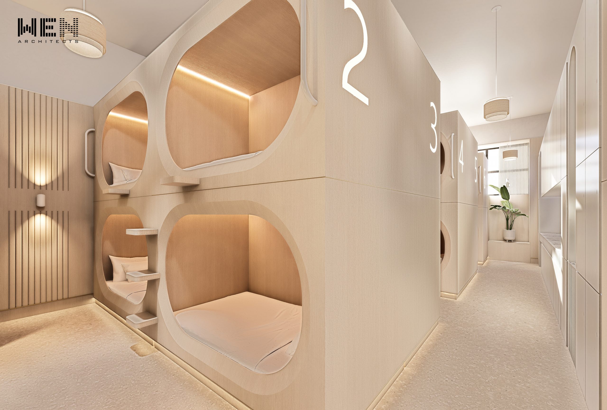 Within the capsule areas, the spatial language shifts to a softer and more intimate tone. Light timber finishes, gentle lighting, and rounded forms reduce the sense of enclosure, allowing each capsule to function as a calm and private retreat. Even within a compact footprint, the design aims to create comfort and a sense of belonging for short-term stays.